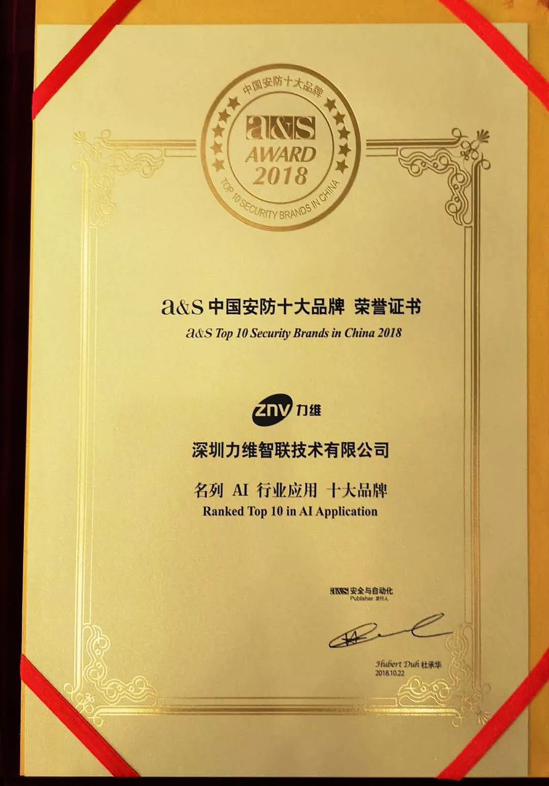 10月22日,“2018a&s中国AI+安防产业高层峰会暨十大品牌颁奖典礼”在北京亚洲大酒店举行,本届峰会以“AI+大安防”为主题,现场的行业精英、专家围绕人工智能、大数据等新技术在安防领域的应用落地展开了探讨。在颁奖典礼上,ZNV力维凭借近一年来人工智能安全产品的创新技术和案例实践,荣获“a&s2018中国安防十大品牌”AI行业应用类奖项。