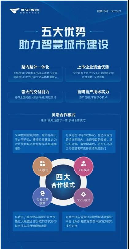 目前,捷顺智城面向各类伙伴开放EPC、BOT、合资运营、SaaS服务等多种合作模式,已成功在广东惠州、新疆乌鲁木齐、山东临沂、江苏扬州、昆山、重庆璧山、湖北潜江、山东济宁、山西晋城、东莞南城、青海格尔木、江苏连云港、四川九寨沟、海南海口、贵州贵阳等全国40多个城市地区落地城市级智慧停车项目,管理路内泊位超100万个,并与惠州交投、临忻城投、常德城投、扬州交投、东莞信宏等地市合作伙伴成立多个合资运营公司,持续推动城市级智慧停车生态发展。