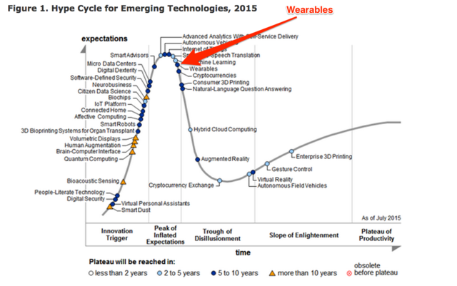 市场研究机构Gartner针对新兴技术发布的《Hype Cycle》年度报告称,消费者对于可穿戴设备的热情将滑向令人心寒的幻觉破灭期。