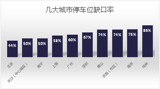通过上图,可以清楚看到,即使按车辆保有量与停车位1:1的比例,上海、广州、深圳的停车位也有超过50%,甚至60%的缺口,而北京情况稍好,但也缺口也超过40%。