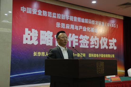 11月12日,长沙市人民政府、公安部第一研究所、国科微电子在长沙签署建设“中国安全防范监控数字视音频编解码技术标准(SVAC)示范应用与产业化基地”战略合作协议,这意味着首个SVAC示范应用与产业化基地落户长沙。长沙市委副书记、市长胡衡华,公安部第一研究所所长仇保利,公安部第一研究所副所长、SVAC标准第一起草人陈朝武,长沙市副市长唐向阳、秘书长谭勇,国科微电子股份有限公司董事长向平、总经理傅军等出席了签约和授牌仪式。