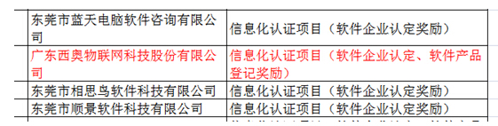 此次信息化专项资金申报按照《东莞市信息化专项资金管理办法》的有关规定,经过项目网上申报、形式审查、专家验收认定评审、第三方现场审计、评选结果公示等工作流程,层层考核筛选,西奥科技凭借自身在物联网行业信息化领域的领先优势,最终得以脱颖而出,一举获得资助。