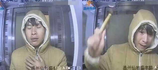 经调取监控录像调查,一个身穿黄色连帽夹克的男子进入警方视线,他摩拳擦掌砸ATM机的过程被清晰地拍了下来。