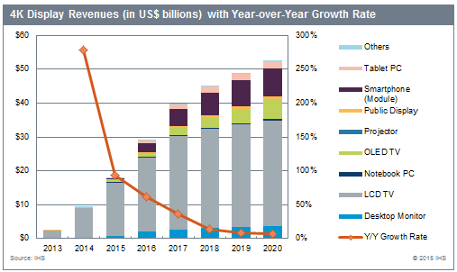 IHS最新的《全球平板显示器出货量季度报告》显示,去年4K显示器市场达92亿美元。4K LCD电视贡献了88亿美元的营收,而2015年,4K显示器将被运用到所有主流设备中,4K市场营收将较去年同期增长94%,达180亿美元。据IHS预测,随着新型显示处理技术的演进,4K显示器产率将有所提升,成本也将降低。到2020年,4K显示器市场将达到520亿美元。