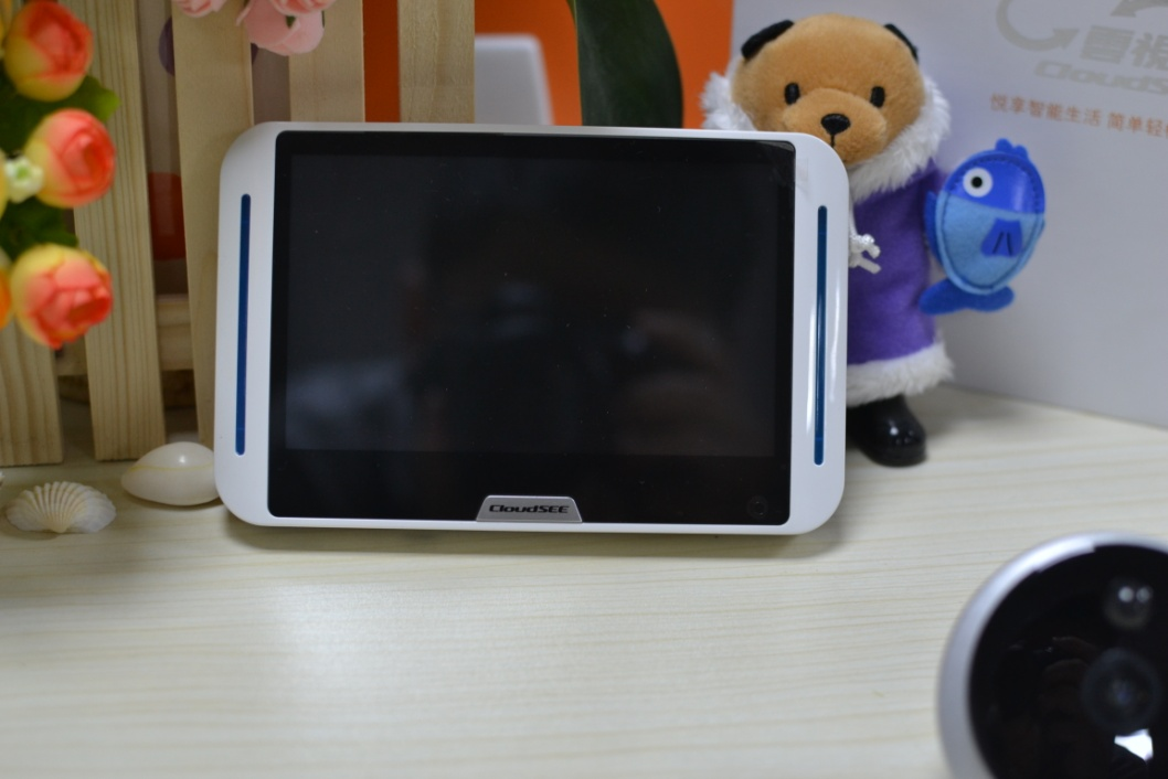 说完外部组件,我们来看门内组件控制大屏,5英寸液晶显示触控屏,触控流畅,操作简易。采用轻薄的材质,搭配竖条型呼吸灯,点亮后高端又显眼。屏幕正下方是品牌LOGO “CloudSEE”,同时它还是整台机子唯一的功能按键。