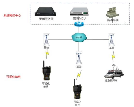 本次系统包括部署于“天网”网络中心的高性能应急指挥平台UCM MCV8000U 1台,该平台支持 16 个1080P高清视频节点的并发高清视频会议,并支持相应数量的应急可视化单兵接入。在应急指挥大厅部署高清视频终端1台,实现前线单兵设备的图像在大厅的高清展示,并可实现与前线单兵设备的音视频互动交流。10台应急可视化单兵可根据对路面交通管控的需要部署于全市各条道路,并借助三大运营商的4G/3G网络实现现场数据回传与双向的音视频互动交流。