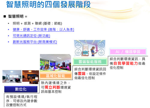 我们都知道,智慧照明呈现出四个发展阶段,首先是具备照明、感测、联网的基础节能阶段;其次是健康、舒适、效率基准的以人为本阶段;再者是可见光通讯定位新阶段;最后是创新光服务平台新商业模式阶段。体现了LED照明数位化、区域化智能、云端智能服务、AI/机器学习的发展特点。