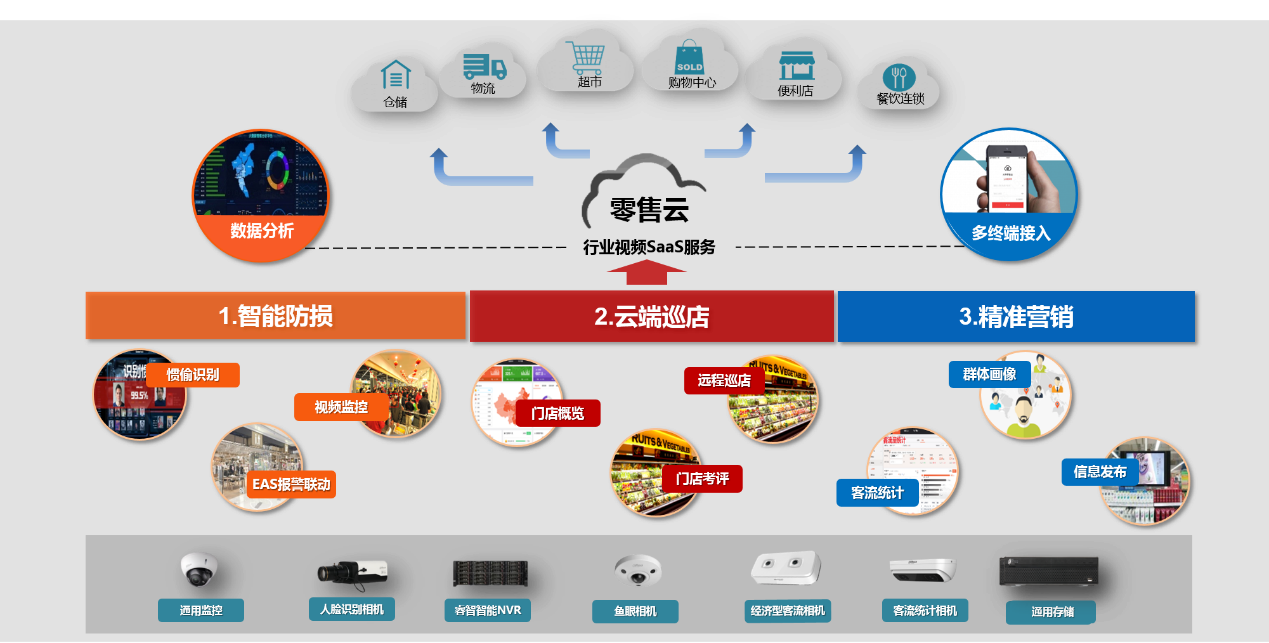 大华智慧零售方案以视频为核心,融合人工智能和零售管理实践,采用智能感知设备+云服务+移动客户端相结合的架构,为零售客户提供一站式、低投入、零运维、可迭代的视频综合应用方案。方案整合客流统计、人脸识别、视频云等大华核心的产品和技术,帮助实体零售减少商品损耗、提升管理效率、实现精准营销,最终帮助实体零售实现降本增效。