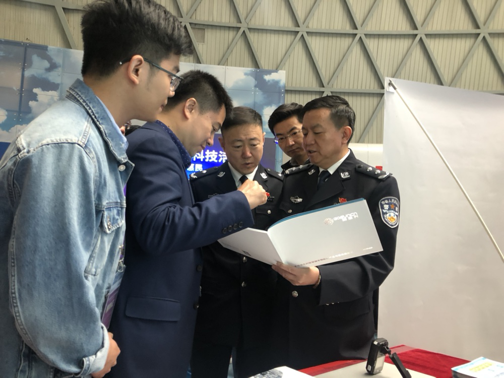 图/青海省公安厅副厅长朱运军在高新兴展台听取“雪亮工程”方案汇报