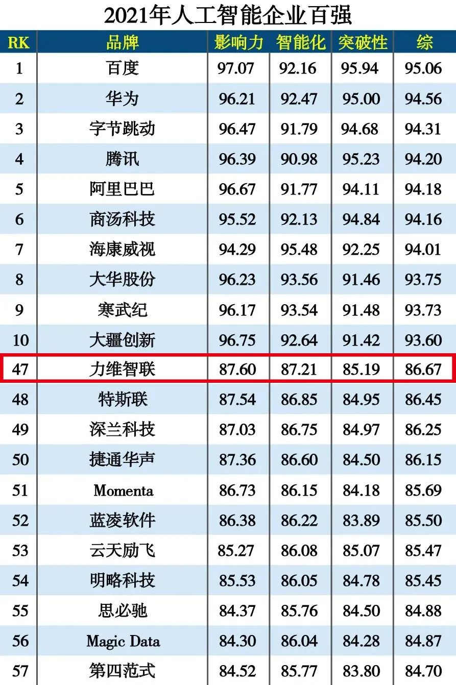 力维智联荣登“2021年度人工智能企业百强”榜单