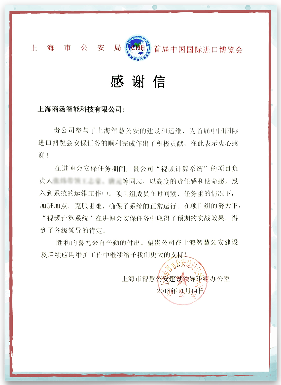上海市公安局发来感谢信,肯定商汤在进博会保障服务中做出的突出贡献