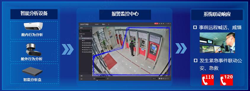 大华自助银行智能防控解决方案,通过智能视频分析技术,自动识别异常事件,以机器代替人力,提高远程值守监控效率,实现可疑行为分析,对危险行为及时告警,保障客户人身、财产安全。
