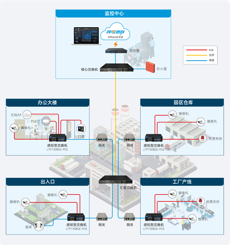 前端接入:采用优特普工业级感知型PoE交换机组网供电,为摄像机、门禁道闸、报警、无线覆盖、Led灯等终端设备提供网络接入和电源,并传输数据。设备加入新型感知技术,能智能化统一管理设备的能耗及运行状态;