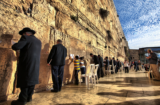 耶路撒冷的哭墙,又称西墙,长约50米,高约18米,由大石块筑成。犹太教把该墙看作是第一圣地,教徒至该墙例须哀哭,以表示对古神庙的哀悼并期待其恢复。现在这里有了个新的传统,人们把写上心愿的小纸条塞到石头的缝隙里,男人和女人也分开祈祷。