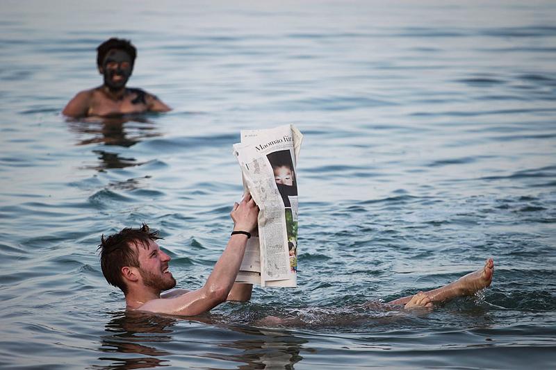 死海浮力大,人可以直接浮在水面上。因此,仰卧在水面上读书看报并拍照留恋成了众多游客的指定动作。