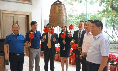董事长宁皓(右二)与集体挂牌企业负责人共同敲响挂牌的钟声