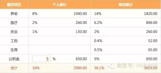 首先假设在做App之前,我们已经有了一个成熟的团队(这是非常幸运的前提,很多产品研发进度极其缓慢的原因之一就是在过程中不断在招人),团队的结构以架构师兼后台开发1名+安卓1名+iOS开发1名+产品经理1名+前端开发1名+设计师1名。你可能也发现了这些人员配备都是单点的,一旦有人生病或请假,某个职位就会缺失,项目进度就会拖后,所以我们大约配备2个浮动名额,也就是,初始团队大概有8名,我们假设团队平均工资在13000左右(憋惊讶,深圳需要这个数,还是比较低的。。。),需要给员工缴纳五险一金,详见下表(假设我们是老实善良的公司,公积金按最低标准缴纳):