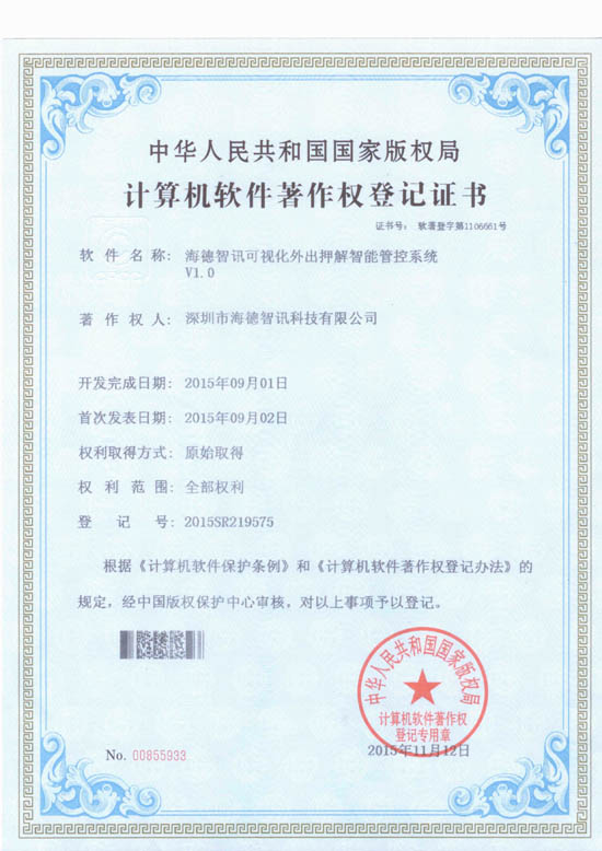 11月12日,国家版权局向深圳市海德智讯科技有限公司颁发了计算机软件著作权登记证书,证书号为:软著登字第1106661号。