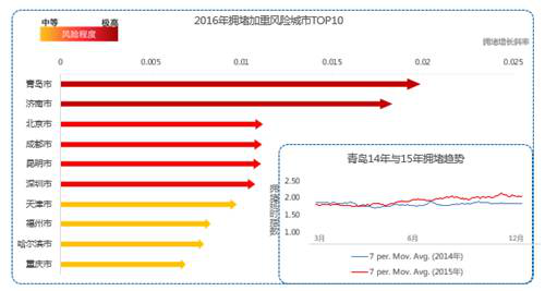 1月19日,数字地图、导航和位置服务提供商高德发布了《2015年度中国主要城市交通分析报告》。高德地图交通大数据通过对2014、2015两年拥堵变化及波动规律,预测2016道路交通拥堵趋势,预计未来几年城市交通拥堵将继续加重,会变的更糟。报告显示,2016年拥堵加重风险最高的三个城市可能是青岛、济南和北京。以青岛为例,从近2年青岛拥堵趋势看,青岛15年拥堵程度上升非常明显,尤其是第四季度。