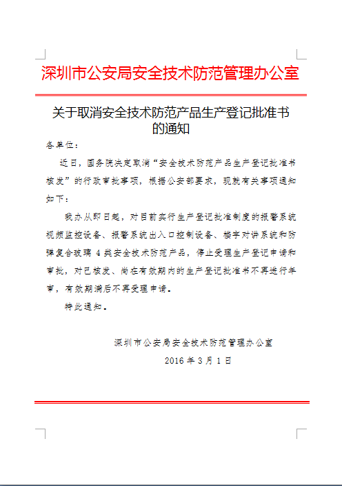 我办从即日起,对目前实行生产登记批准制度的报警系统视频监控设备、报警系统出入口控制设备、楼宇对讲系统和防弹复合玻璃4类安全技术防范产品,停止受理生产登记申请和审批,对已核发、尚在有效期内的生产登记批准书不再进行年审,有效期满后不再受理申请。