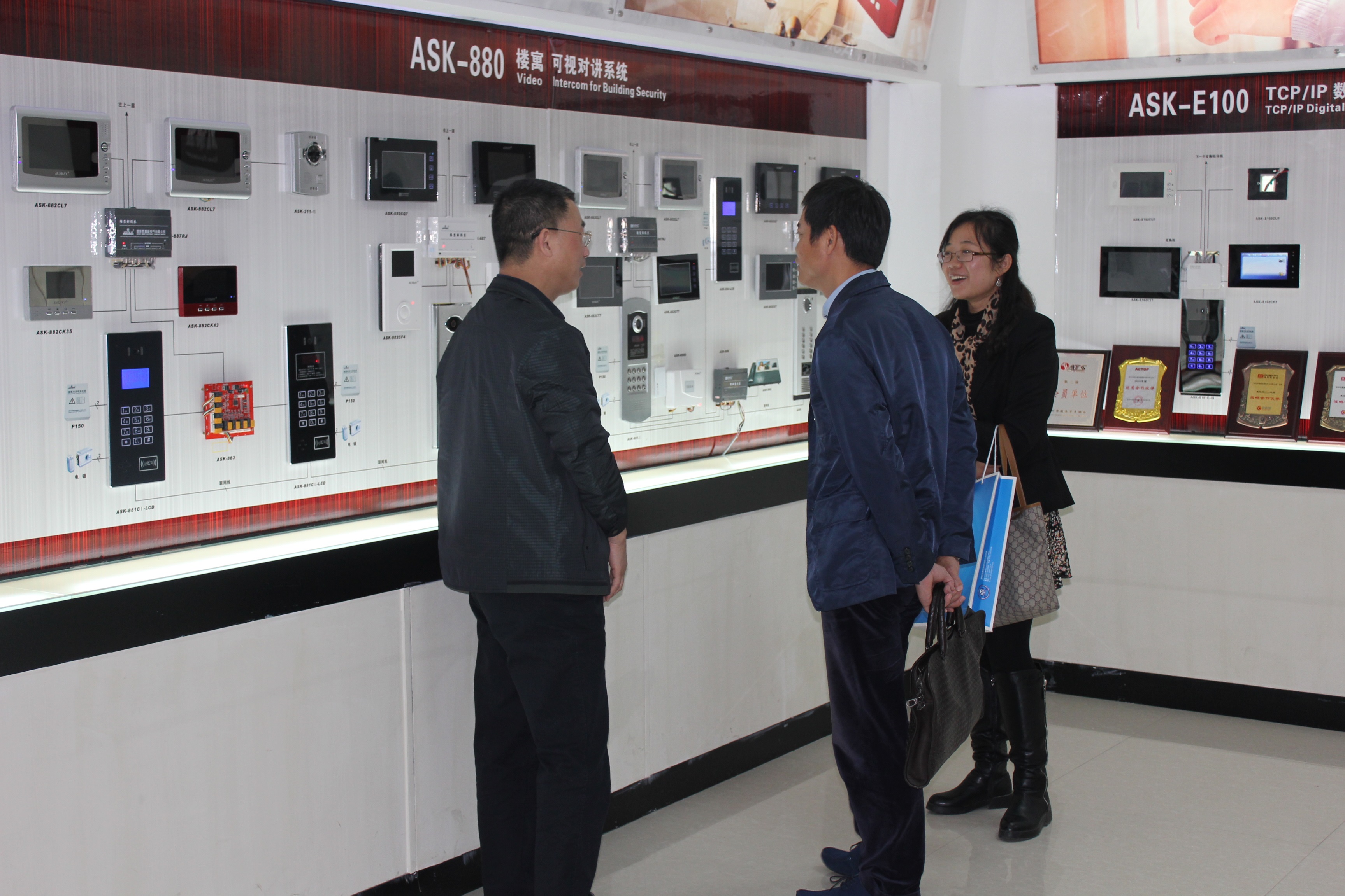 在参观中,澳斯凯总经理王知名向张毅秘书长介绍了公司的发展情况:公司引进世界最新智能电气控制技术,广泛应用于小区楼寓智能化控制。最新推出TCP/IP网络运行ASK-E100系列小区全数字可视对讲系统,具有小区物业管理、信息发布、可视对讲、报警监视、门禁控制、家居智能化控制等功能,是目前世界上最先进的小区智能化产品。
