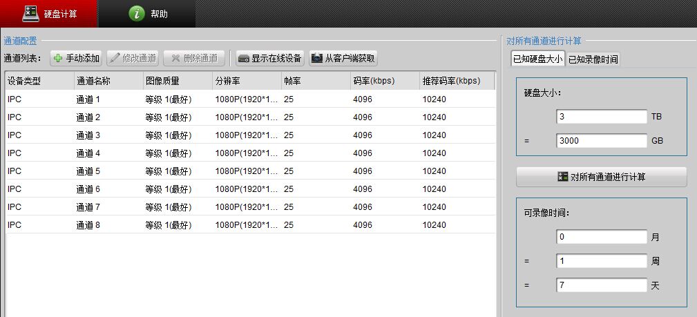 可以看出,该品牌录像机连接了8个200W的IPC,默认码流是4096Kbps,使用了3T的硬盘仅能保存7天的录像。