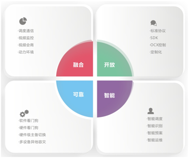 融合各类语音(模拟话机、IP话机、对讲机、智能终端、便携设备)、视频(监控视频、可视电话、智能终端、便携设备、车载设备)、大屏(液晶、DLP、LED等拼接屏)、动环(门禁、风机、气体浓度、温湿度)等资源,实现资源整合和灵活应用。