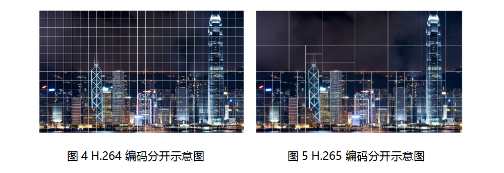相比H.264,H.265提供了更多不同的工具来降低码率。H.265的编码单位可以选择从最小的8x8到最大的64x64。信息量不多的区域(颜色变化不明显,比如天空的灰色部分)划分的宏块较大,编码后的码字较少,而细节多的地方(细节变化较多,比如大楼部分)划分的宏块就相应的小和多一些,编码后的码字较多,这样就相当于对图像进行了有重点的编码,从而降低了整体的码率,编码效率就相应提高了。这个过程有点像“感兴趣区域编码”,针对重要的更多关键细节的部分进行增强划块,无更多关键细节的部分进行简单划块,但是这个过程在H.265上可以自适应识别实现。