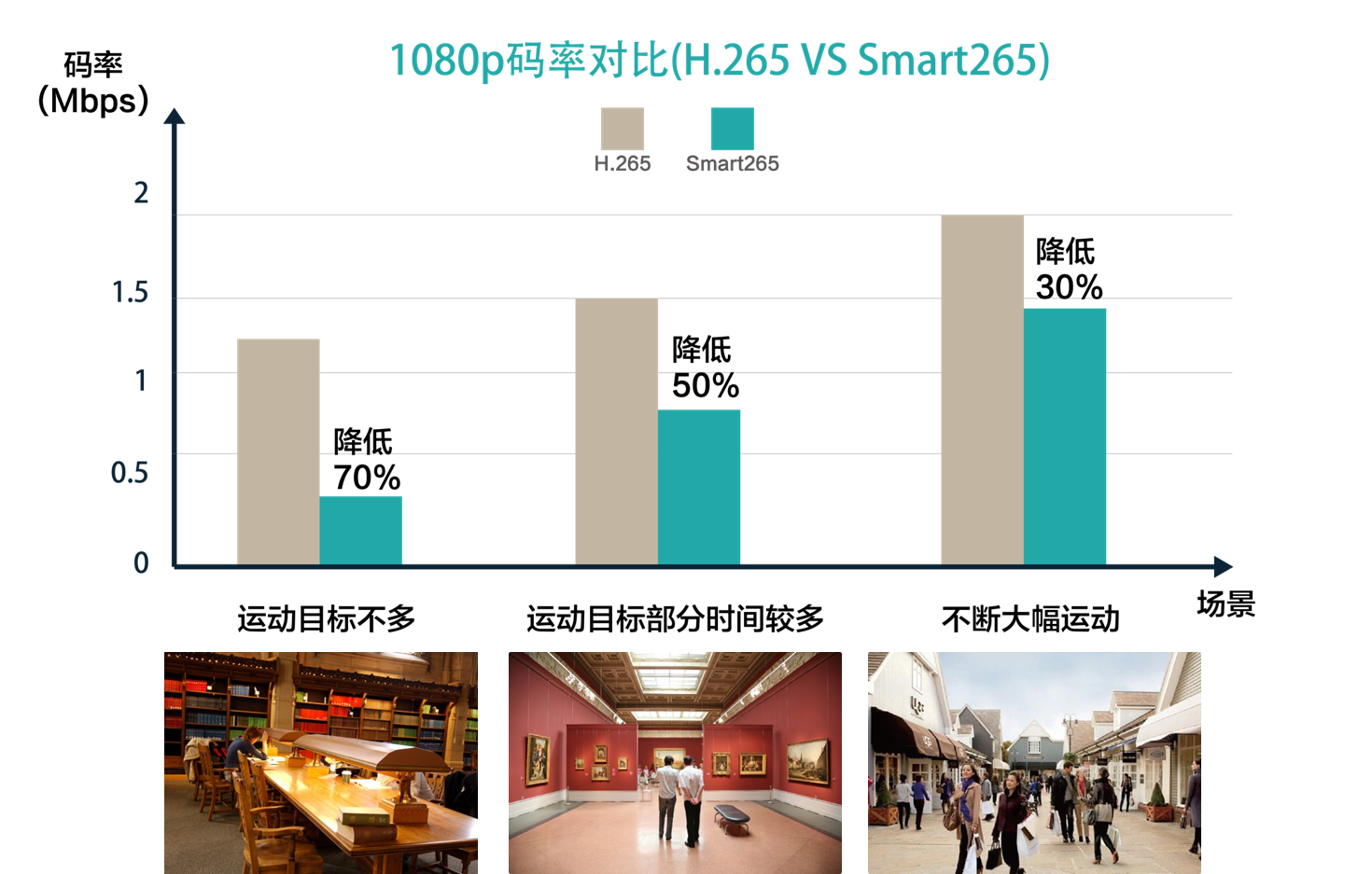 图2 不同场景下1080P摄像机码率对比(H.265 VS Smart 265)