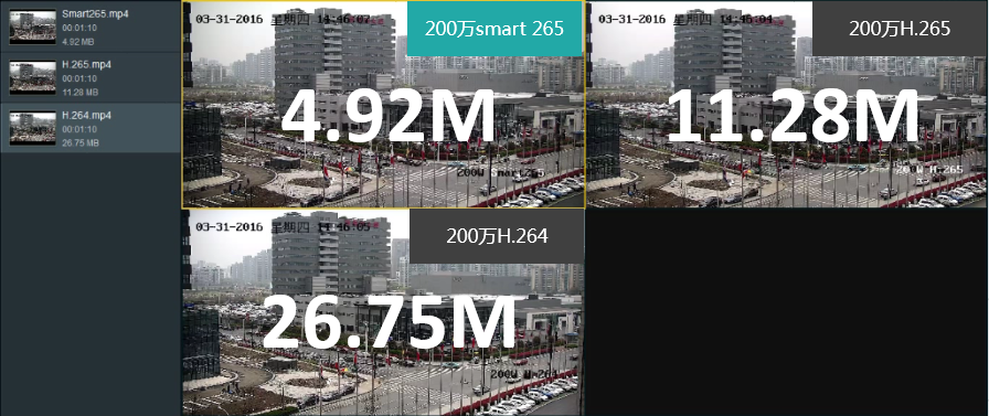 图3 同一场景下不同编码方式1080p摄像机录像文件大小实测比较