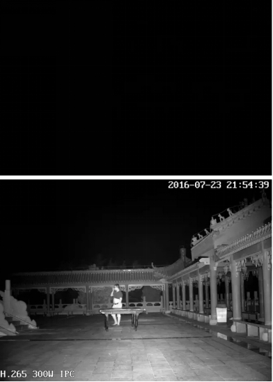 上下两图分别为:手机拍摄的实际场景和开启红外之后黑白图片的对比