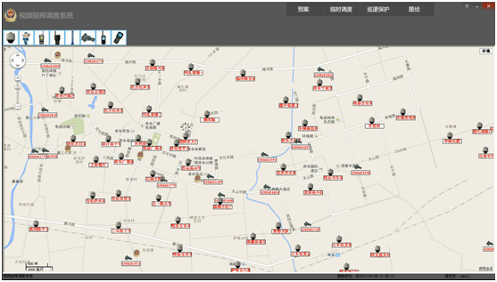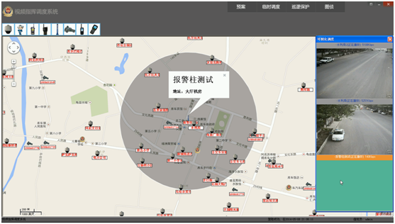 3. 自动弹出报警点的地图,并标示出附近的警力分布情况(巡逻人员、车),并自动调度显示现场视频监控图像;