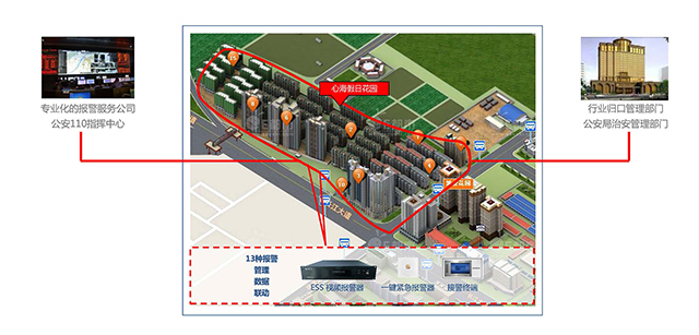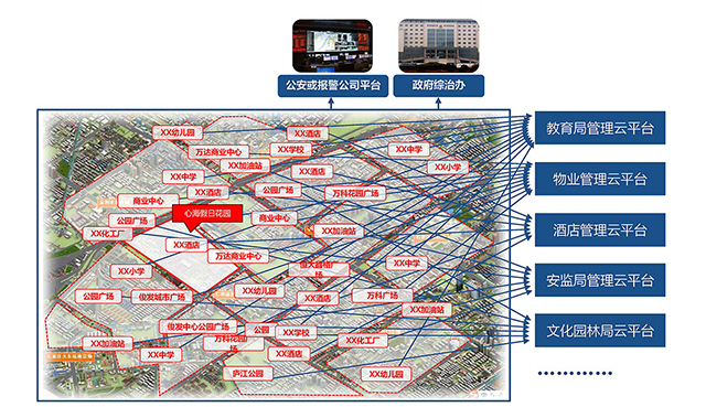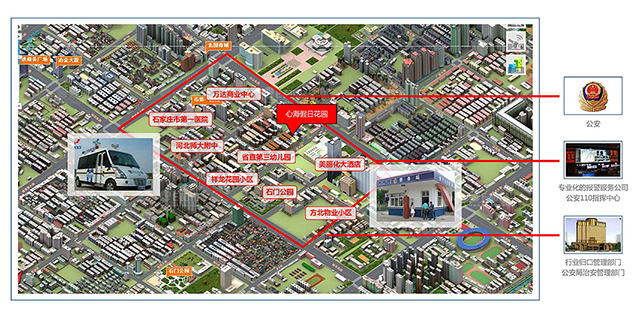 对各行业及社区街道等重要区域进行布点与防控,将报警现场、联网报警中心、本地保安、联防保安、行业管理人员、公安等与报警事件相关的元素整理融合,形成一个协同完整的立体化防控体系,为社会安全治理提供高效的监管工具。